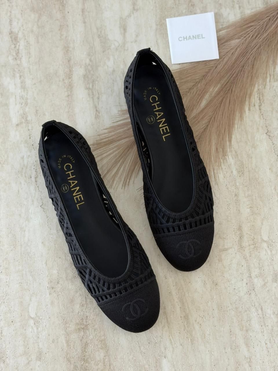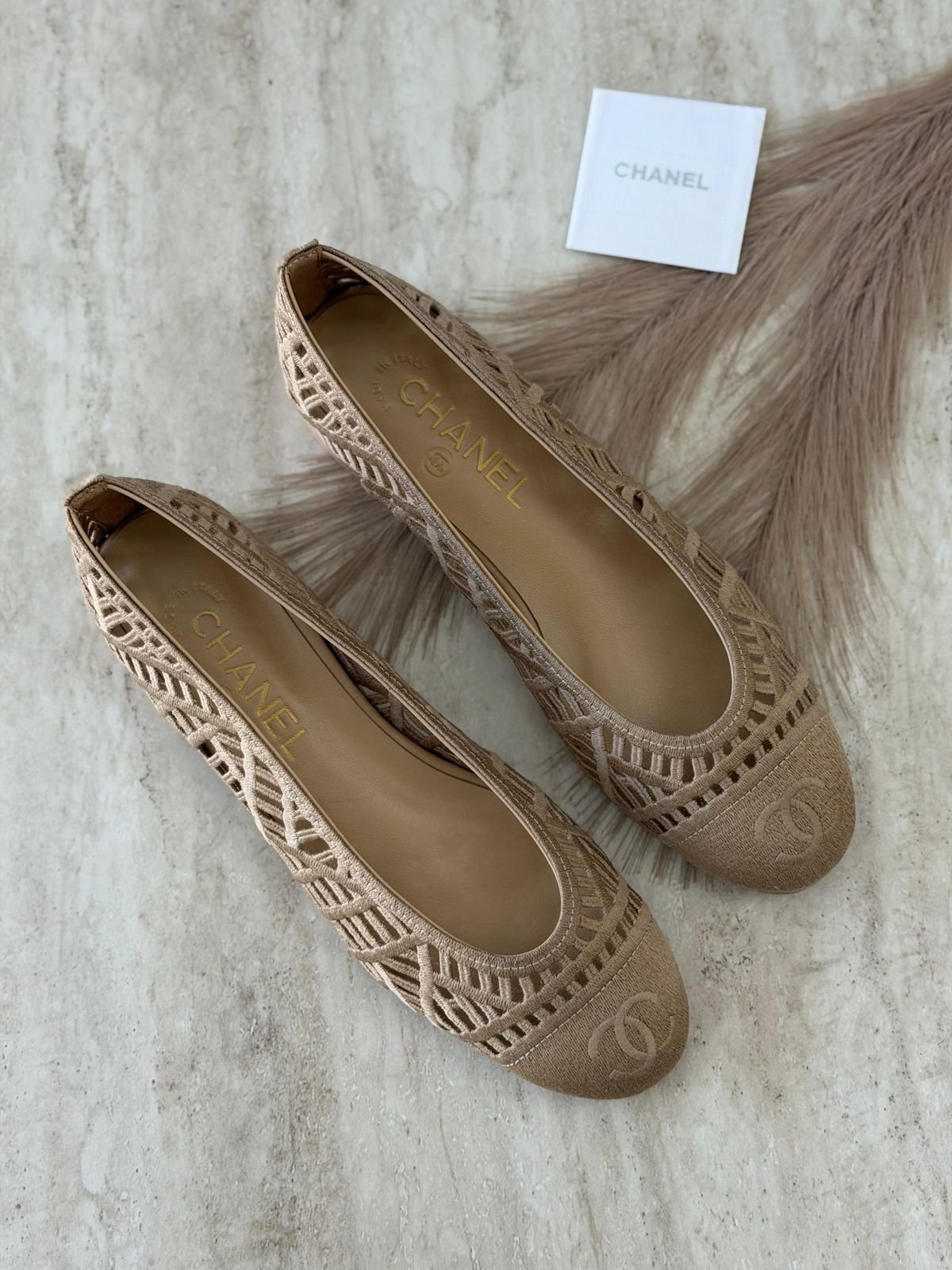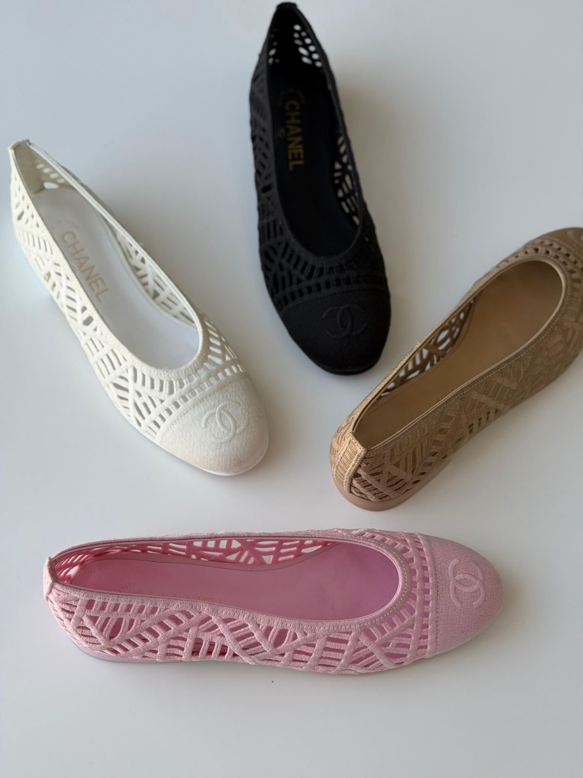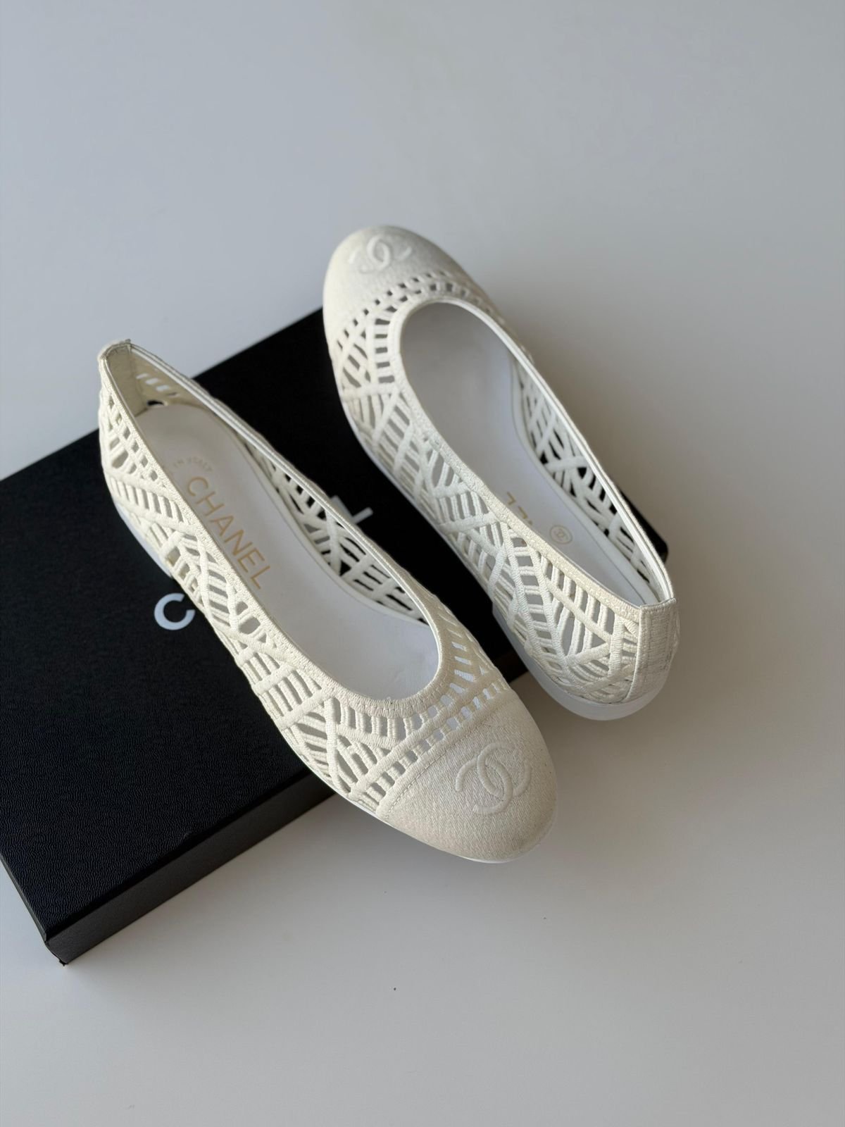Elevate your daily ensemble with these exquisite Chanel Ballet Flats. Expertly crafted with a unique mesh-like open-work design, these shoes offer both breathability and a modern aesthetic.