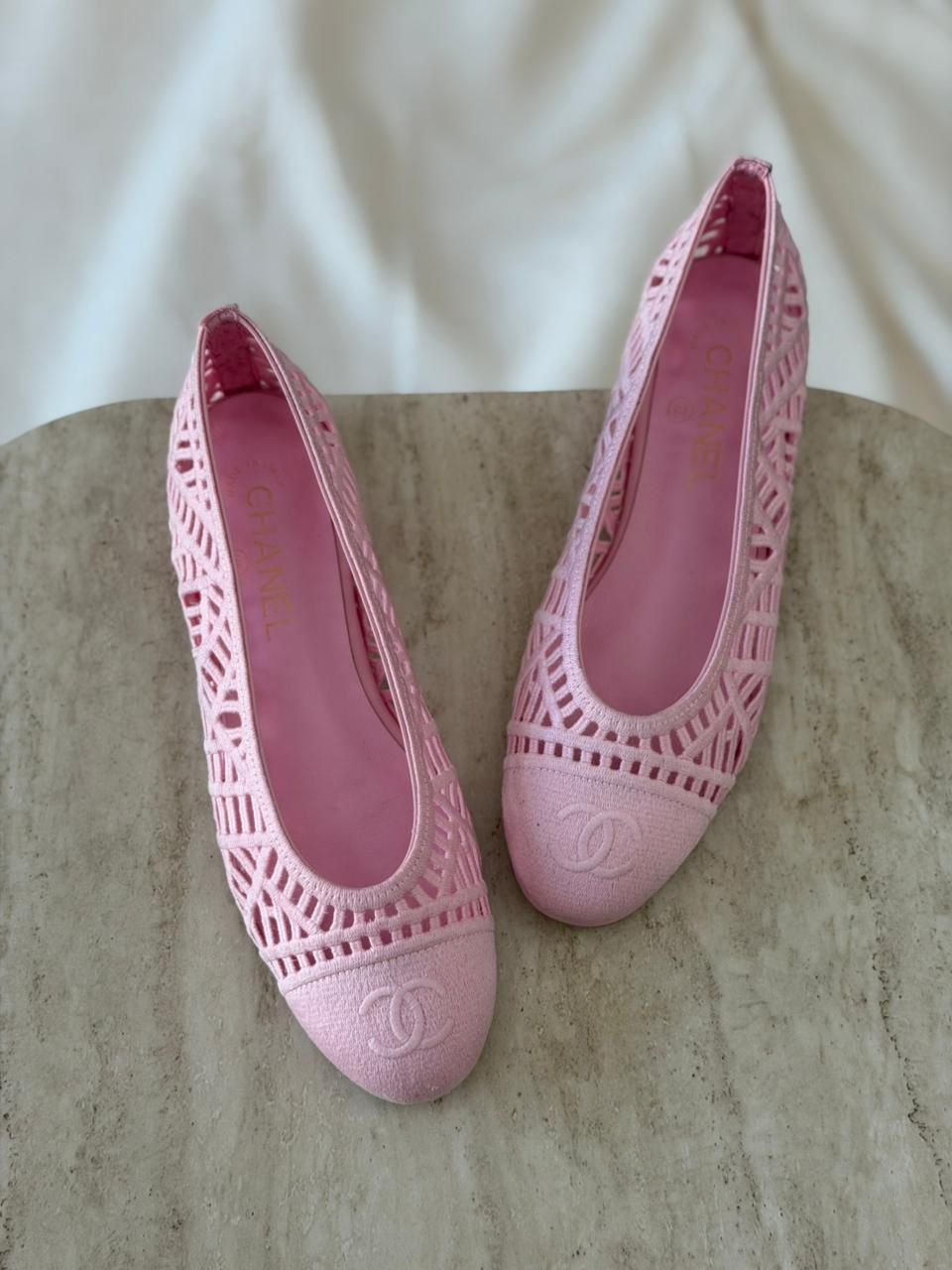 An elegant take on the classic ballerina silhouette, these Chanel flats feature an intricate cut-out lattice pattern with the iconic interlocking CC logo embroidered on the toe cap. Lightweight, breathable, and timeless.