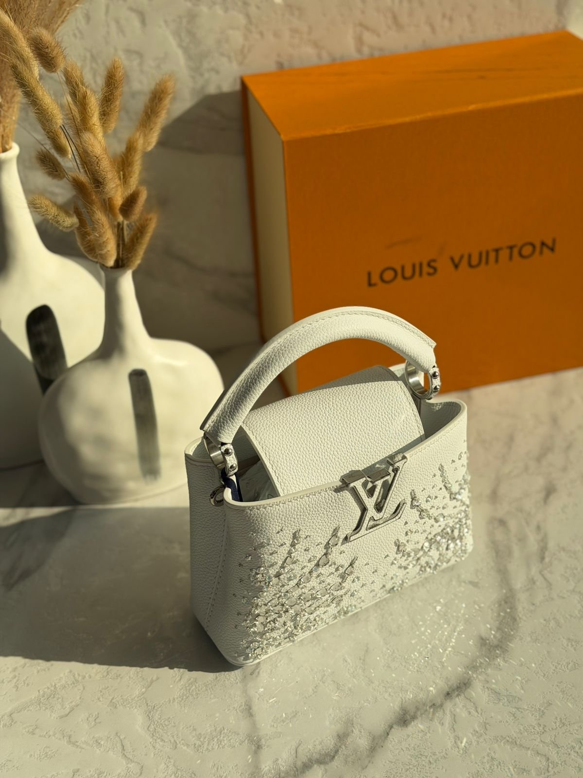 Overview: The Capucines Mini Crystal Edition is the ultimate expression of luxury and jewelry-like craftsmanship. These special edition Louis Vuitton style handbags take the iconic structured silhouette and elevate it with radiant crystal embellishments that catch the light from every angle. It is more than a bag; it is a piece of art for your wardrobe.