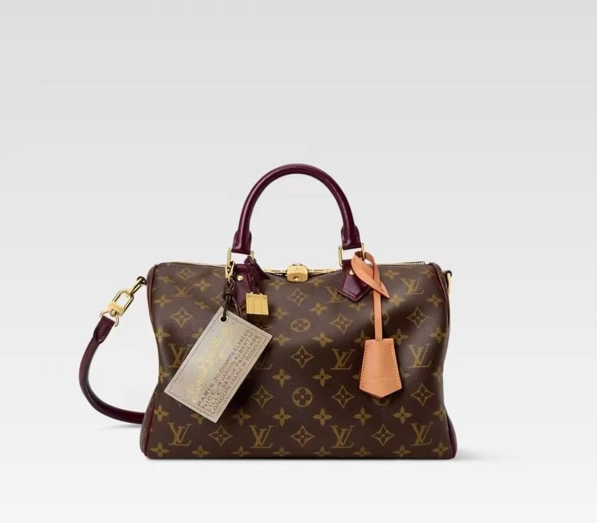 Accessories: Includes a detachable leather strap for shoulder or cross-body wear, a custom gold-tone padlock, and a unique leather luggage tag featuring the “L. Vuitton” script.